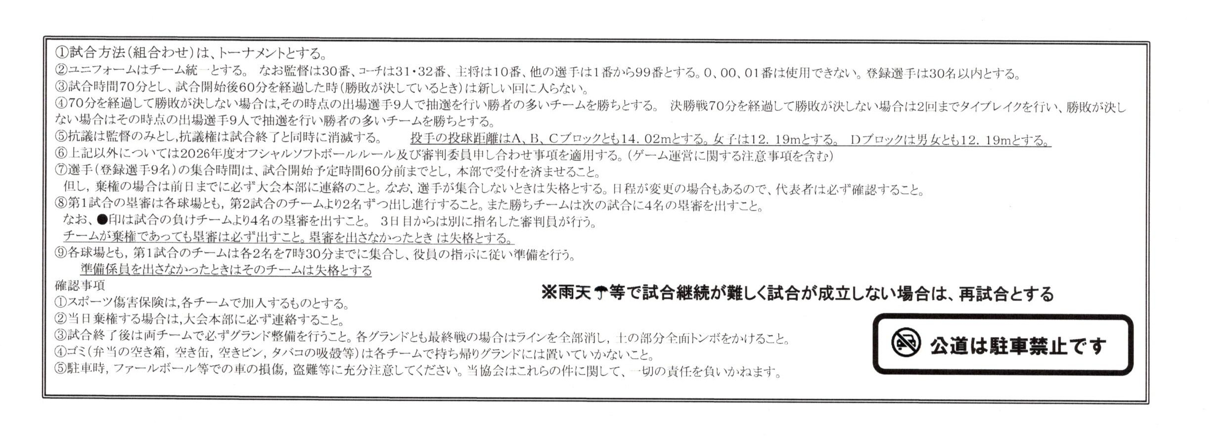 4月5日、12日、19日 予備日26日 役員集合7:00 準備員集合7:30 第1試合の各チーム「準備員」 第2試合の各チーム「審判」の担当を忘れずに行って下さい。(大会要項を参照) 開会式はありません 第1試合 8:30 第2試合 9:45 第3試合 11:00 第4試合 12:15 第5試合 13:30 第6試合 14:45 田…田野市民球場 石…元石川市民球場 東…東野市民球場